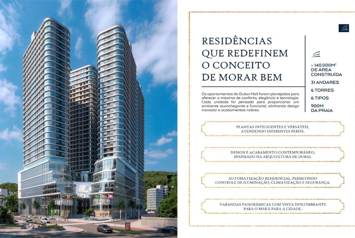 Imagine um empreendimento que une a grandiosidade e o luxo de Dubai com a beleza exuberante de Porto Belo, Santa Catarina. O Dubai Mall Porto Belo é uma oportunidade única de investimento imobiliário, projetado para mulheres como você: que valorizam segurança, rentabilidade e um estilo de vida sofisticado.