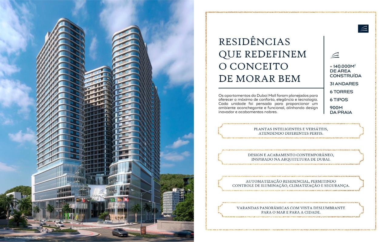 Apresentamos o Dubai Mall Residence, um empreendimento monumental idealizado pela PH Empreendimentos, estrategicamente localizado na Avenida Governador Celso Ramos, no cobiçado bairro Perequê, em Porto Belo – SC. Uma chance única de investir em um projeto que combina luxo, conveniência e altíssimo potencial de valorização.