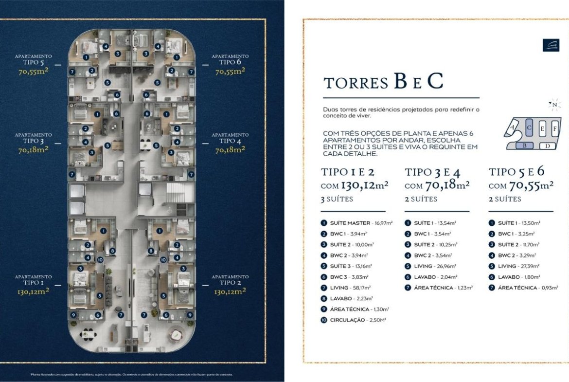 - Apartamentos 3 quartos: 130 m² (apartamentos amplos, para quem busca mais espaço e sofisticação)