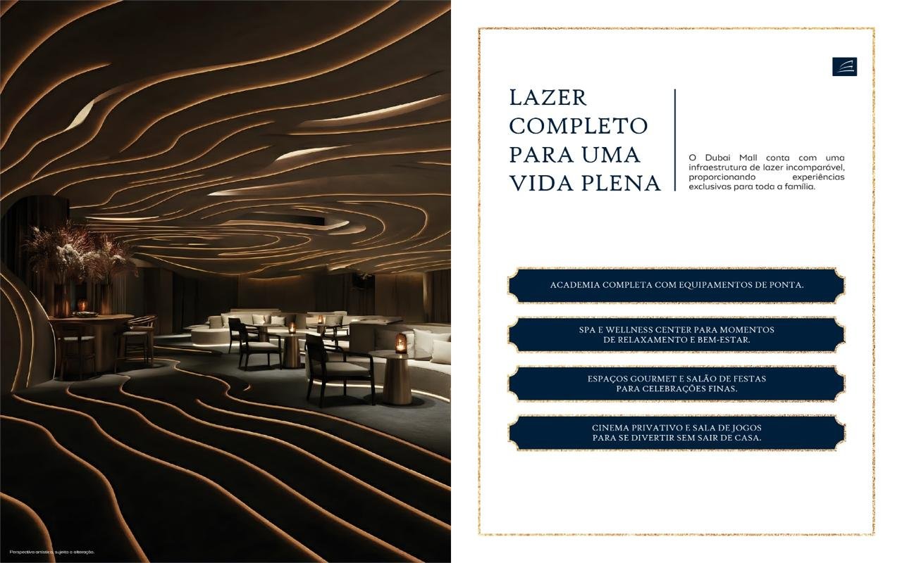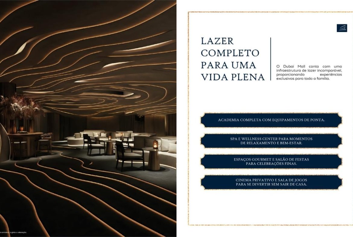 - Infraestrutura de Lazer Excepcional: Com mais de 3.000 m² de lazer externo (piscinas adulto e infantil, quadras esportivas, spas, espaços gourmet) e áreas de lazer internas privativas em cada torre (academias, salões de festas, salas de reunião), o Dubai Mall oferece um estilo de vida desejado, elevando o valor percebido dos imóveis.